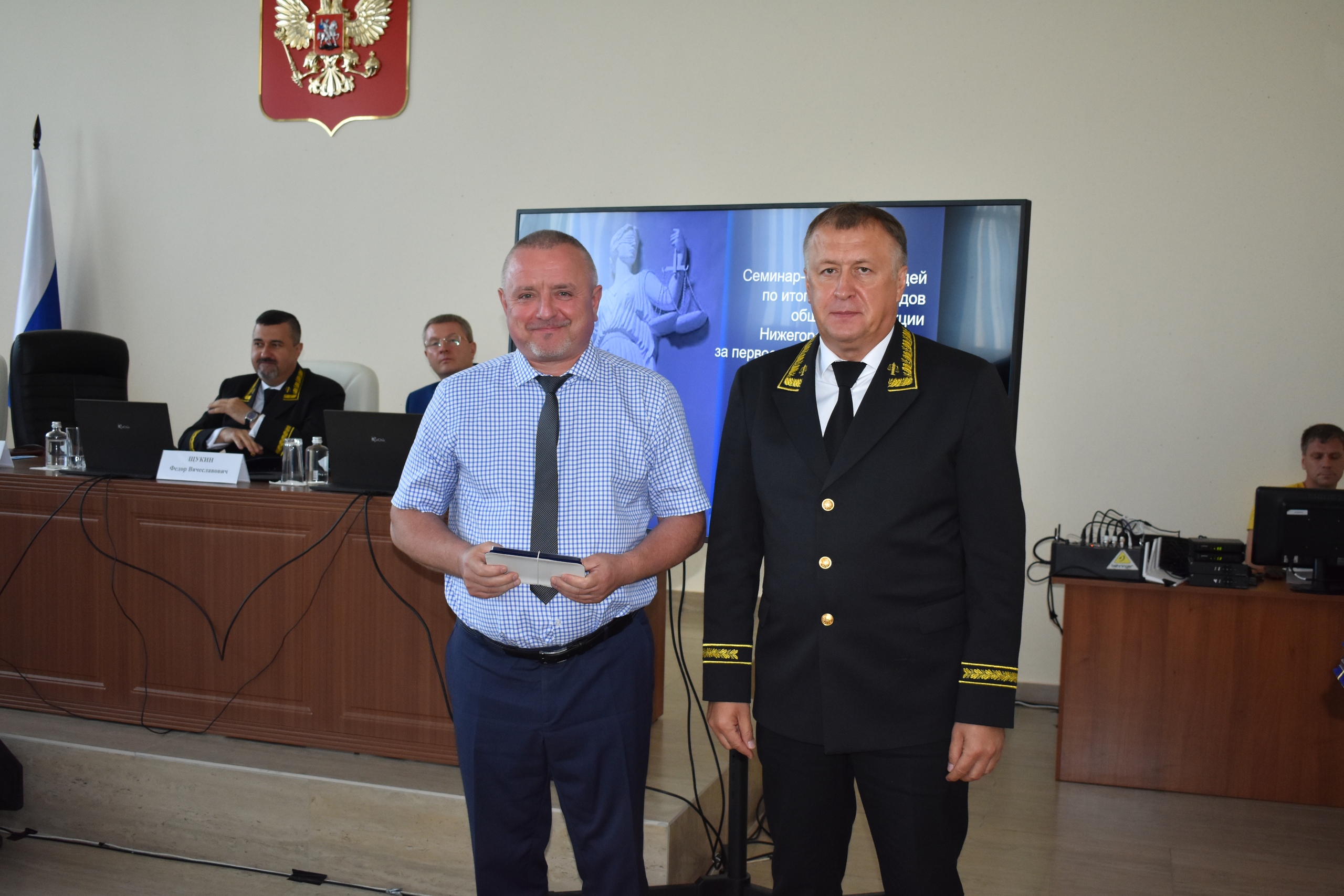 28 июля 2023 года в рамках семинара-совещания, посвящённого подведению итогов работы судов общей юрисдикции Нижегородской области за I полугодие 2023 года, председатель Нижегородского областного суда Вячеслав Поправко вручил почетные награды судьям и сотрудникам Управления Судебного департамента в Нижегородской области.
